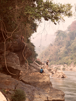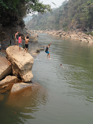 Nat tot op het bot varen we tot de lunchplek en op de rotsen begint Chang met een barbecue terwijl de rest samen met Tan van een 10 meter hoge rots gaat springen. Althans, dat is de bedoeling. Wat mij betreft, geen haar op mijn hoofd en ook Fer hoeft gelukkig niet zonodig. De rest van het gezelschap wil eigenlijk wel, en om een beetje gevoel te krijgen beginnen ze bij 3 meter. De Fin maakt een salto achterstevoren! Dat belooft.