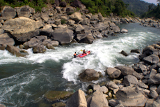 Het is prachtig gebied waardoor we varen, met steile rotsen en veel groen. Dan naderen we de eerste stroomversnelling. Helmen op, want het is een derdegraads. Ik merk dat ik lichtjes tril. We moeten heel goed opletten: eerst rechtdoor, dan iets naar links en daarna naar rechts, de boot recht vooruit houden en áltijd de peddel vasthouden. We gaan ervoor en er hangt een heel vervelend spinnetje voor mijn ogen te bungelen. Geen tijd tien, concentreren! Dat is echt moeilijk… nog ff ‘goed’ zitten en toch nog ff dat vervelende spinnetje… We liggen voor de versnelling, gaan erin, boot helt naar rechts in een kolkende witte waterstroom en ik ga als een blok mee (hoezo, soepel in de heupen). En dan liggen we erin, peddel vast, komen tegelijk boven, hoesten en happen naar lucht en worden weer naar onder meegezogen. De stroom sleurt ons allebei een andere kant op en de begeleiders zijn fantastisch! Met moeite bereik ik de kayak (gered door Tan) en lukt het me erop te klimmen. Dan samen stroomopwaarts richting Fer. Wat een kracht heeft die jongen! Fer heeft zijn eigen avontuur, inclusief een paar keer naar beneden gezogen worden in een maalstroom. Als Fer er uiteindelijk ook weer in/opzit, moeten we nog in het vaarwater zien te geraken maar dat gaat gelukkig goed. Ik merk dat ik helemaal tril als we op Tan aan het wachten zijn; hij moet via de rotsen eerst weer naar zijn kayak zien te komen, wat geen geringe opgave is.