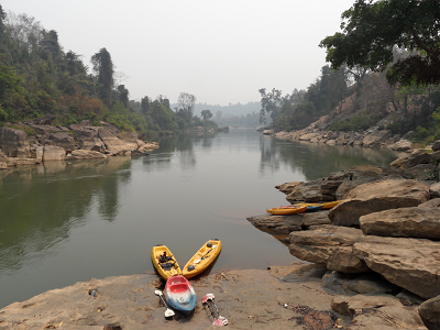 We worden door een tuktuk opgehaald en met een groepje van 7, een Fins koppeltje en 3 jongens uit Engeland, rijden we richting Hin Heup om zo ‘n 4 uur te kayakken op de Nam Lik. De kayaks hebben meer weg van een surfplank dan van een kano, met een deuk voor je zitvlak en 4 voetsteundeuken. We zitten samen, Fer en ik, en dat komt heel goed uit want al na 5 minuten begint mijn rug zeer te doen en ook mijn liezen vinden het niet fijn in die boot. Achteruit liggen met mijn benen gestrekt over de voetsteun verlicht iets, dus die houding zoek ik vaak op, en dan is al het peddelwerk voor Fer.